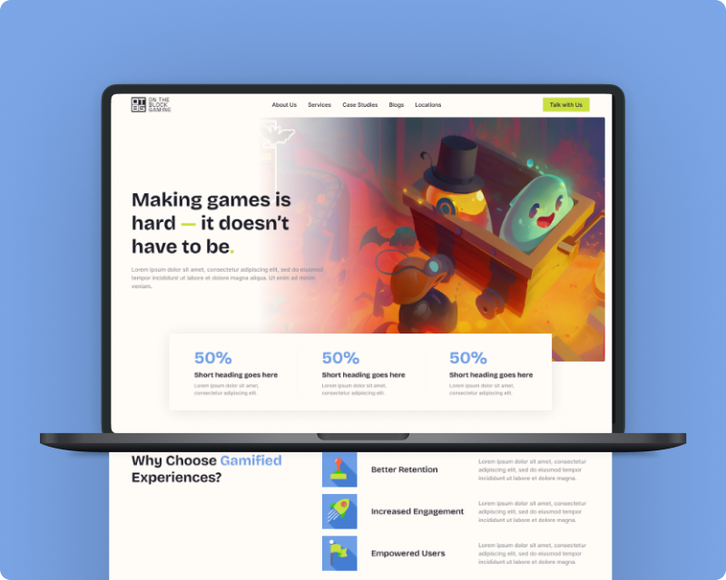 The previous On The Block Gaming website lacked the dynamic and interactive feel expected from a modern gamification platform. Our development approach focused on creating a fluid, engaging user experience that aligns with their innovative solutions for gamified processes.